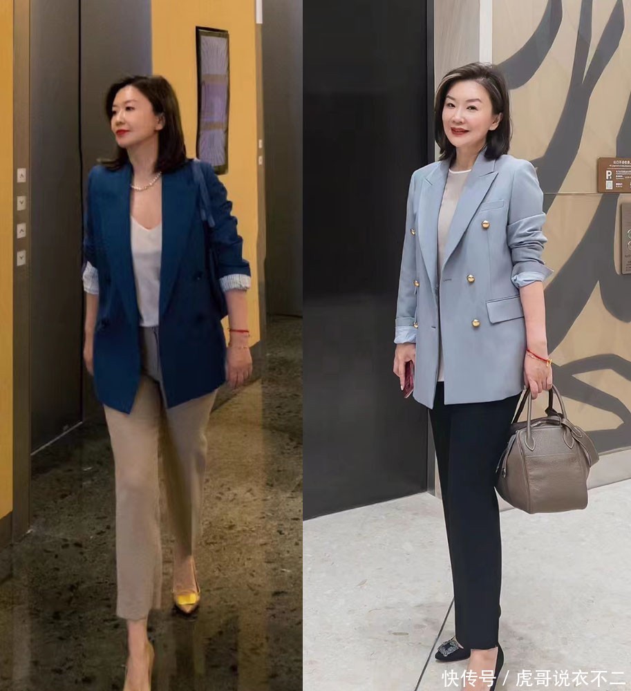 但西服的具体遴荐照旧要把柄个东说念主条款来远隔,举例上图这两件不同色系的西服,共同点是版型不会太松垮,不会太抉剔体型,而浅蓝色比起深蓝色,更相宜气场偏柔柔的女性。