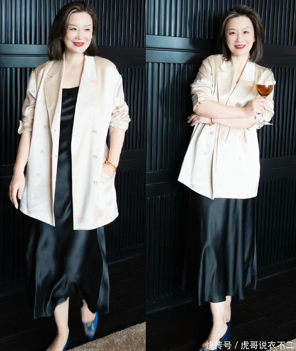 小西装不错说是职场标配,利落的廓形外不雅,不错强调出上半身的利落线条感,从而弱化女性的和蔼气质,呈现出更有气场的外形。